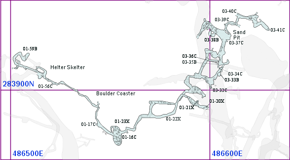 A sandy crawl (formerly QM 2001-14B) leads to a small passage. This closes off up + to the right; the main way goes past a dead furry bat to a sandy hole which was dug out in 2003. This tube goes up steeply. At the top, straight ahead leads up into small chamber, with a a series of sloping pitches, Pingu, which lead to a more vertical section of about 25m. Beyond this, the pitches continue [C2008 ?? A]. On the left is a 15m pitch which becomes too tight. The main way from the sandy tube follows the draft to the left, along a crawling tube past a couple of not-bad straws into a small chamber. There is a thin, deep, narrow rift to the right (leading to a small shaft?). Ahead, there is a nasty loose hole to left but the main way is under a low wall + crawl up a ramp on the right side. Over a loose boulder wall, to the right went to a pitch head with a huge boulder perched on top [C2003-204-35 B]. It's possible to free-climb down this rift to the left to a drippy floor, and Martin climbed a further 2m below this without reaching the bottom of the shaft (doesn't look promising though). Various tubes above pitch head probably don't go [C2003-204-34 C] [C2003-204-36 C]. The main way is to the left after the boulder wall, crawling to the edge of a ramp, passing a small passage on right [C2003-204-37 C]. It is possible to climb down to the left. At the bottom, on the left is a nasty loose pitch I nood noodles which ends at another nasty awkward pitch-head [C2008 ?? C]. Ahead, clamber over boulders. At the far end, a small passage leads off and up but gets too small. Climbing up and to the left, a solution tube in the roof can be followed for several metres to the top of an aven before closing down. The main way on at the ramp is across and up to a small sandy tube. Continuing down this and to right leads to a crawly passage with odd boulders in it needing gardening + more bat skeletons; this in turn leads up and past final squeeze into a quite large drippy rift. This continues to the left [C2003-204-40 C]; to the right it is possible to climb up two levels (first one a rather dodgy free climb) until it becomes too hard to up-climb, but aven continues up beyond this point [C2003-204-41 C]. A small side passage on the left from the sandy tube leads to [C2003-204-39 C].