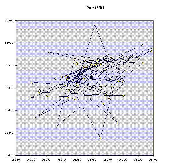 There were 723 track log points, taken in 50 sections at 41 positions (some places were logged more than once to see what repeatability was like - (see Figure 2, page 15). For each section of logging the average position was calculated in X & Y. At this point I have to explain the complications of co-ordinate conversion. This is by far the biggest problem in using a GPS. Although the unit knows all about a whole host of co-ordinate systems and origins, the serial data downloaded is always in Lat./Long. format using the WGS84 spheroid. When you record positions they are likely to be in the locally useful co-ordinate system, and this is what you will need to plot positions on the map. In the UK this will be 'OSGB'. On an expedition you need to do a bit of research to find out what you should be using and how to do the necessary conversions. The OS publish a very useful couple of documents 'Transverse Mercator Projection - Constants, Formulae and Methods', and 'Conversion of Latitude and Longitude to/From National Grid'. I have photocopies of these if anyone needs them - they may now also be available on the net. These sums have been turned into a DOS program called 'CONVERT.EXE' (imaginative stuff!), and a RISCOS Basic program, both of which I also have.