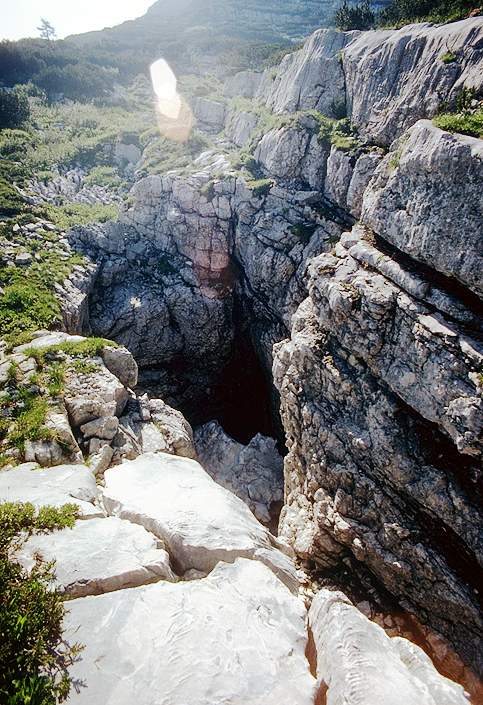 View across the entrance shaft of Glitterstompf. The wall to the right is north-facing, and the cave is extremely cold, with good ice formations early season. Top Camp is just a short walk off to the right. The cave was explored in 1993 in the belief that it was unexplored, but research now shows that this was first explored in 1976, and numbered "B9". The number was already hard to spot in 1977, but the cave is now marked with a stamped metal tag.