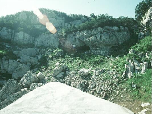 The entrance to 1623/172 (a 40m long choked tube) seen in 1995, when it was numbered with a metal tag. Sepp Steinberger is standing just to the left of the entrance, which is seen from a snowbank on the route to 173.