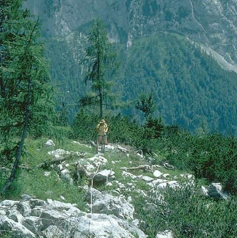 Pete Lancaster surface surveying on the SE slopes of the Vorderer Schwarzmooskogel in 1983, above the Stellerweghöhle system.