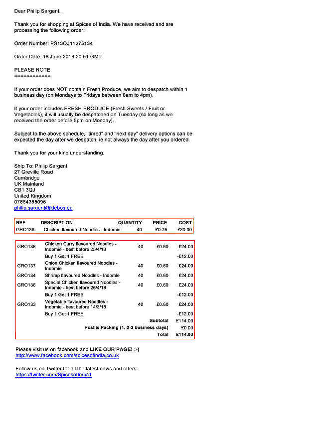 | instant noodles | Philip S. | 240 | 6x flavours of boxes 40x pkts each. Spices of India partial bogof and delivery note (one item missing) |