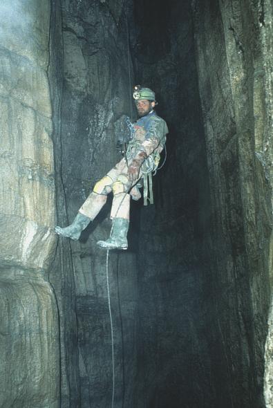 Andy Atkinson on the first pitch of Steinschlagschacht in 1997. Modern rigging leaves this drop less exposed to the stonefall which gained the cave its name in the original 1983/4 explorations.