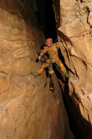 While we'd like to say it was teamwork and cooperation that led to successes in two deep leads simultaneously, it seems that 'friendly' competition worked just as well. Un-British rope grabbing and name calling began when it became clear that the budgeted 2.5km of rope would be used to the very last metre. Nial Peters mustered a group of cavers who felt that Razordance ('Pussyprance') was for wimps, and the real action was in the stratigraphically deepest, maze-like levels of Steinbrücken, accessed via the 80m Gaffer Tape pitch and following series.