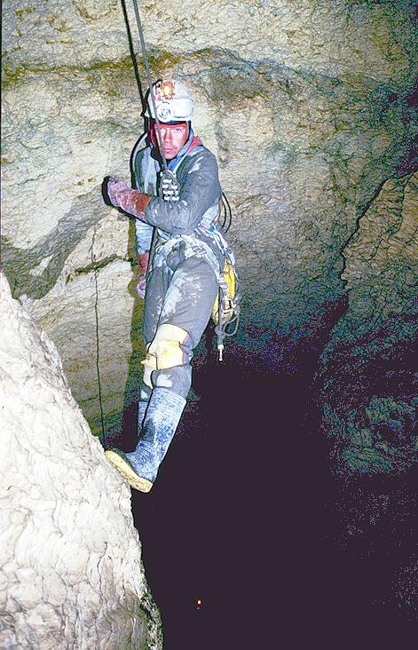 Julian Haines on the pitch into Cloud Chamber in Puffball and Icing Sugar Cave (Bovist und Puderzuckerhöhle, 1623/182). Photo © Andy Atkinson, 1992