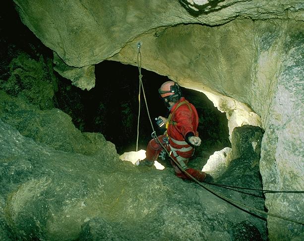 The large "Chunnel" passage on the right hand route is interrupted by this short pitch into more large passage at a complex area. The easy take off is reached by a slightly greasy scramble down (traverse line). Photo © Andy Waddington, 1993
