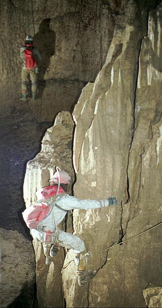 Staircase 36 seen beyond the traverse over Gob on You, Kaninchenhöhle Photo © Andy Atkinson, July 1992.