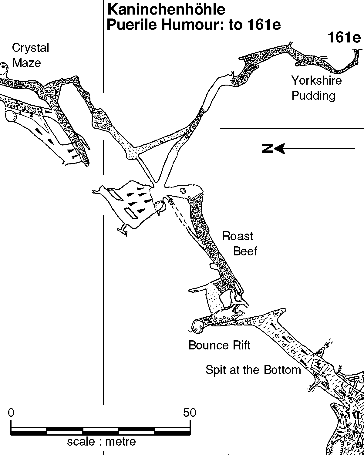 Roast Beef quickly degenerates to a bedding plane crawl. Traversing to the left of two blind pits, a hading rift chamber is reached. A short climb down to the left is blind, straight ahead is a crawl which leads to Crystal Maze. To the right is the continuation of Roast Beef, a draughting phreatic tube. A passage on the left after 20m also leads to Crystal Maze. After a further 60m, a boulder choke is reached which was dug out in 1996. This reached a small chamber after 5m, which is within sight of daylight. A further 5m of crawling uphill through a short squeeze leads to the 161e entrance/exit.