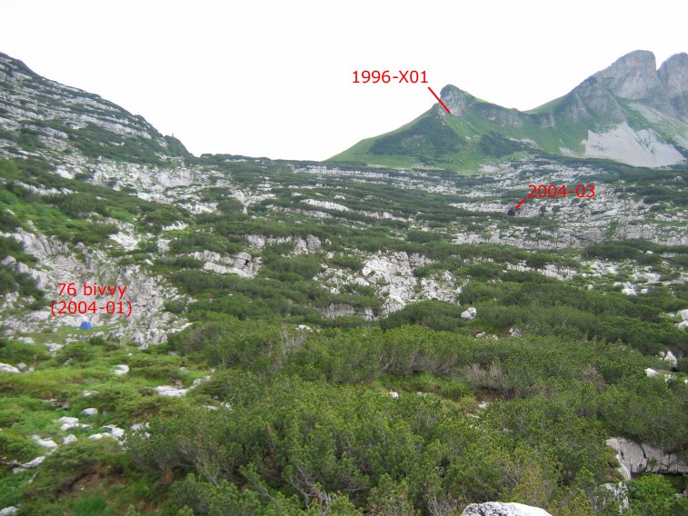 This view from a high point not far from Eislufthöhle entrance was taken in 2004. Several entrances are obvious, including the 76 bivvy site. The other obvious entrance, just above and to the right of the tent in the photo, has also been checked, and goes nowhere; but no number has been allocated to it.