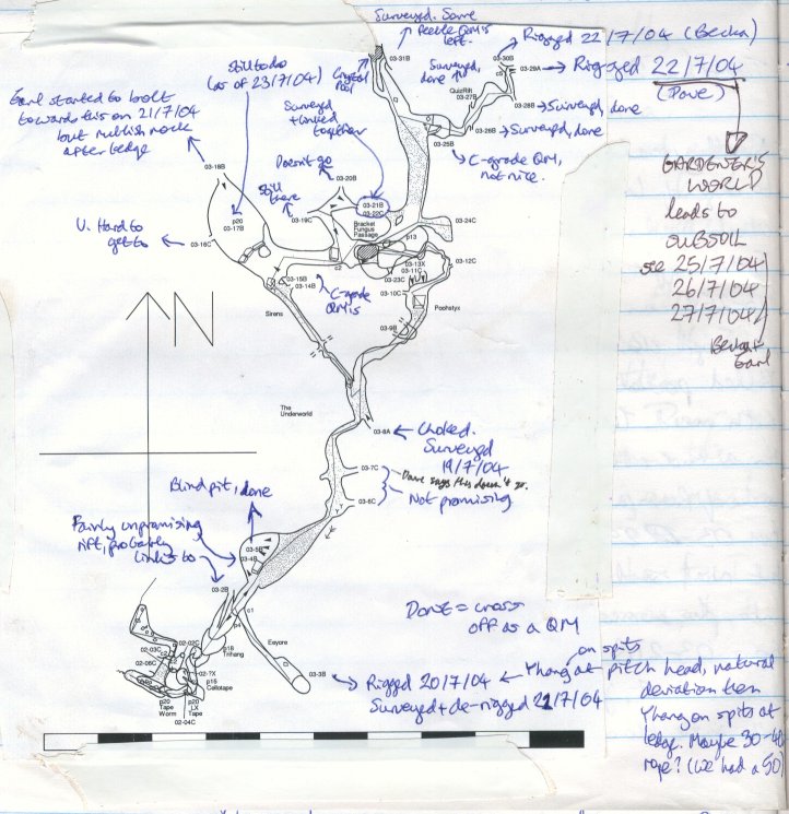 Derigged the traverse + the 4m pitch into Earthenware and Nial [went] off to find Earl whilst I derigged Gardeners World. Earl had put in a bolt and a sling to let you get into / out of Oxtail Oxbow easily (we have taped off Bracket Fungus Passage to stop people using it, so everyone should be going via Oxtail Oxbow). Earl had put the spits in for Black Maria but didn't have enough rope so we gave him some + he put in a knot pass + descended. Apparently the shaft (large at the head of Sirens) narrows down so there is only a relatively small chamber at the bottom with only a QM C leading off downslope from the bottom. Nial + I were very relieved to find the tape was just long enough to survey to the bottom of the pitch without us having to descend it. Earl derigged and I derigged the traverse then we collected all our rubbish together at the base of the Gaffered pitches. Nial and I each got a a very stuffed tacklesack while Earl got his drill and associated rubbish. I volunteered to start derigging the 65m so went up last. I'd foolishly forgotten the traverse up to Eeyore – how? I had a brief + foolhardy attempt to derig it with my 1.5 tacklesacks. Wrong. I then moved the bags to the end of the traverse and had another go. Still impossible – nothing to stand on. Whinged up at Earl and was tempted to abandon it but I finally stuck a sling around a knobble at the top, derigged the top bolt on the traverse then free-climbed down the other side of the rift to the traverse (which was how Earl and I had rigged it this year). After that derigged the 65m fine + headed up slowly with both jammers slipping badly again on the rope due to mud – despite our best efforts at cleaning wellies and jammers. Waited whilst Earl put in one good and two failed spits at the top of Gaffered to improve the traverse at the head and out, at last, tired.
