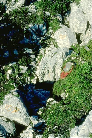 The entrance to Gemshöhle, 1623/107 - a draughting hole which had to be dug, at the western edge of the plateau. Photo © Andy Waddington, 1984