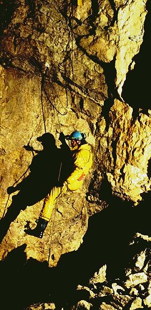 One of the pitches in Dreamtime (we hope to bring you more details of which one shortly). Paul Smith is descending, having just passed a rebelay, on the Dreamtime/Knossos/Yapate photographic trip of 1990-07-28. Photo © Mark Dougherty, 1990