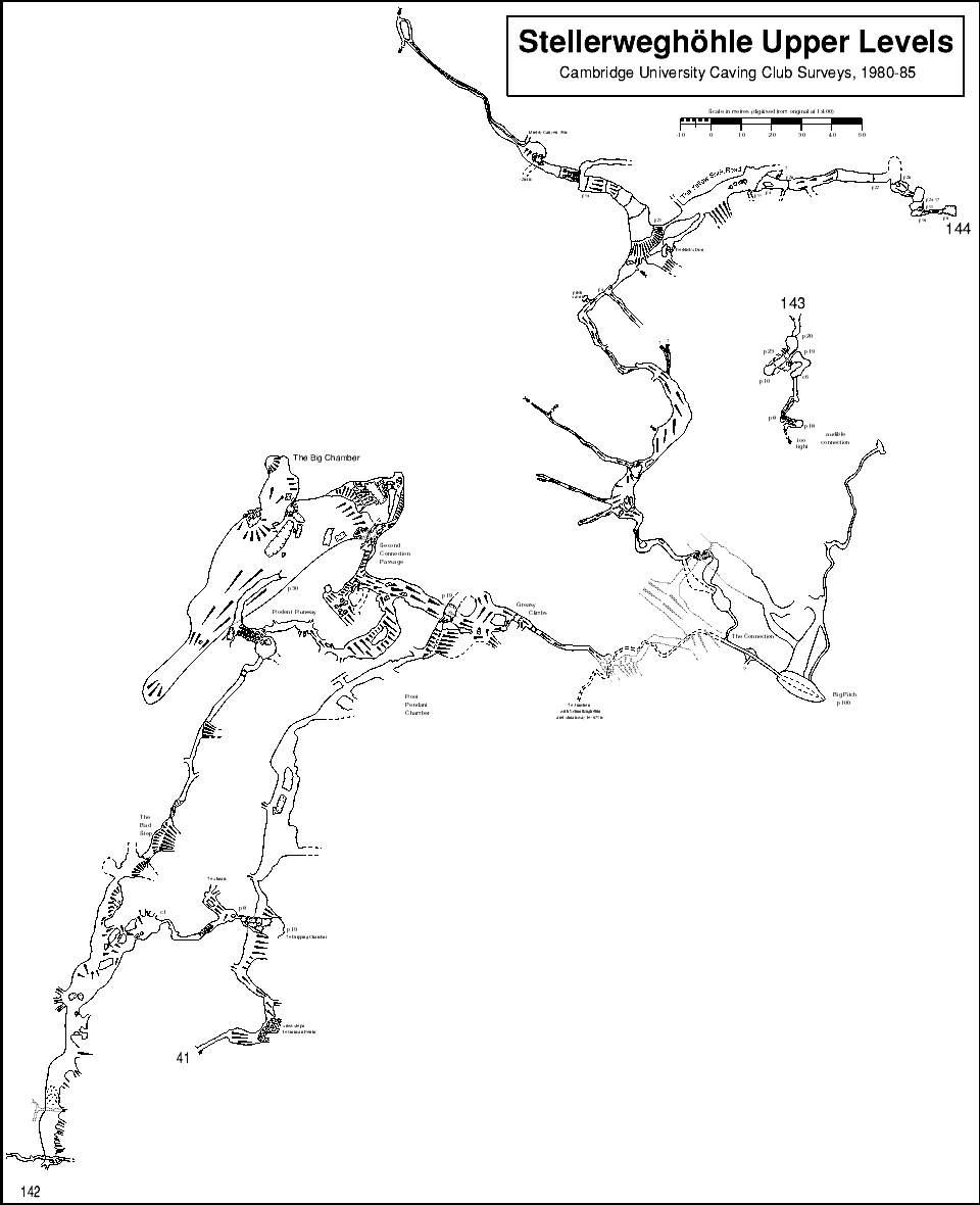 After the high entrances of 143 and 144 were explored, and the latter was connected into Stellerweg, and considerably more exploration was done in 142, including two connections into the main system, a lot more survey data was available, all of it above the Big Rift in Stellerweg. All these passages were drawn up, at a larger scale than the original published survey, and with the fridge north error corrected. However, this survey has never been published - CUCC stopped working in the cave and the project petered out.