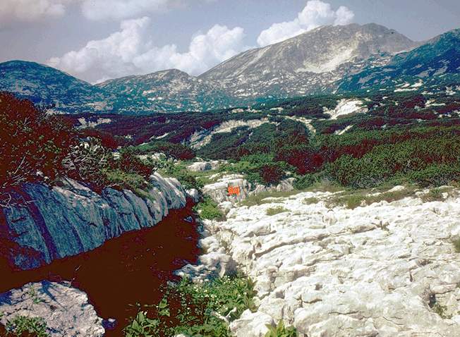 The entrance to 1623/94 on the Loser plateau, as it appeared in 1989. This view is from 1623/93, some way out from the Bräuning Wall, roughly north back towards Schönberg (top right). Top camp is off to the right. The cave is vertical, but freeclimbable to a choke at -35m. It was explored in 1977.